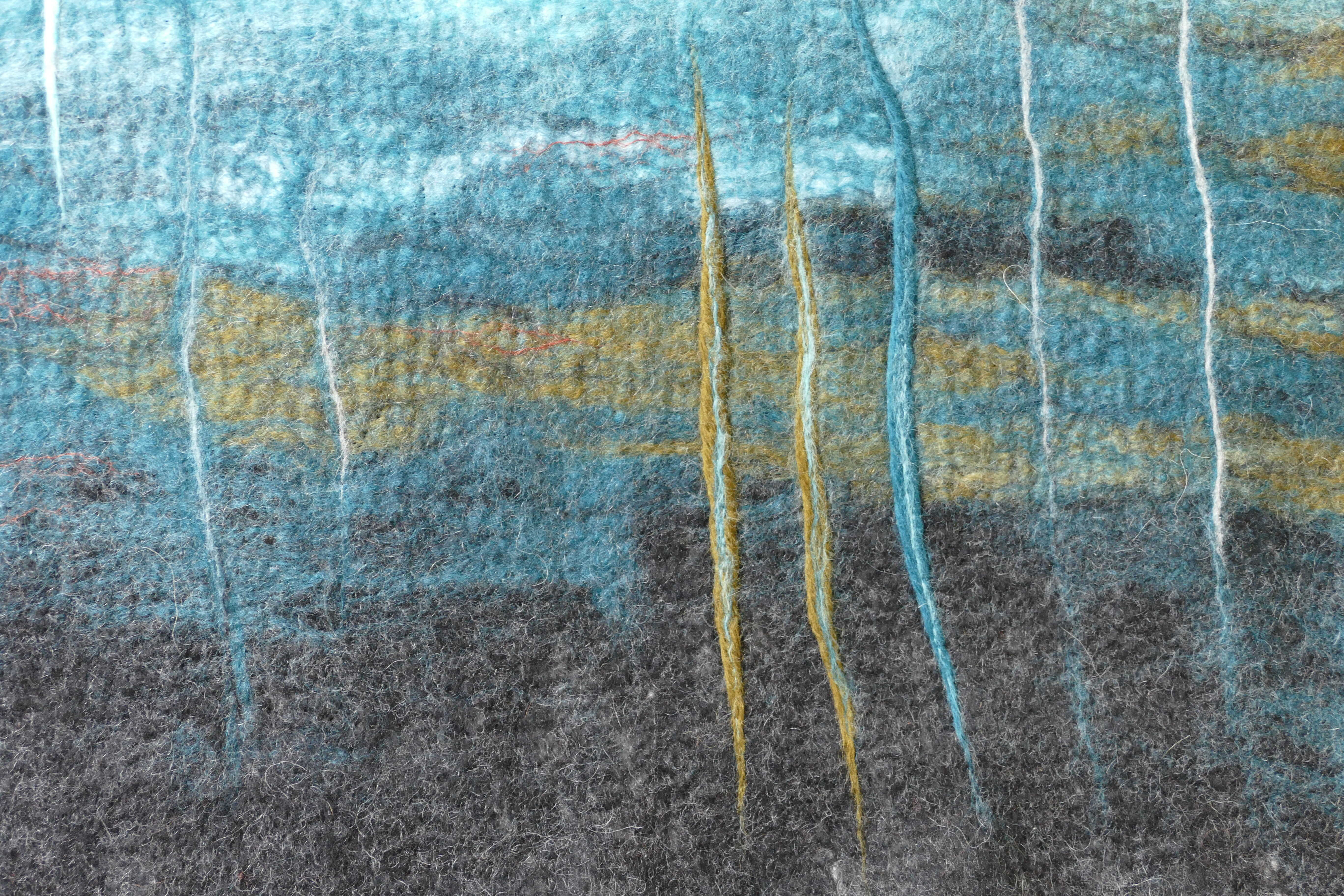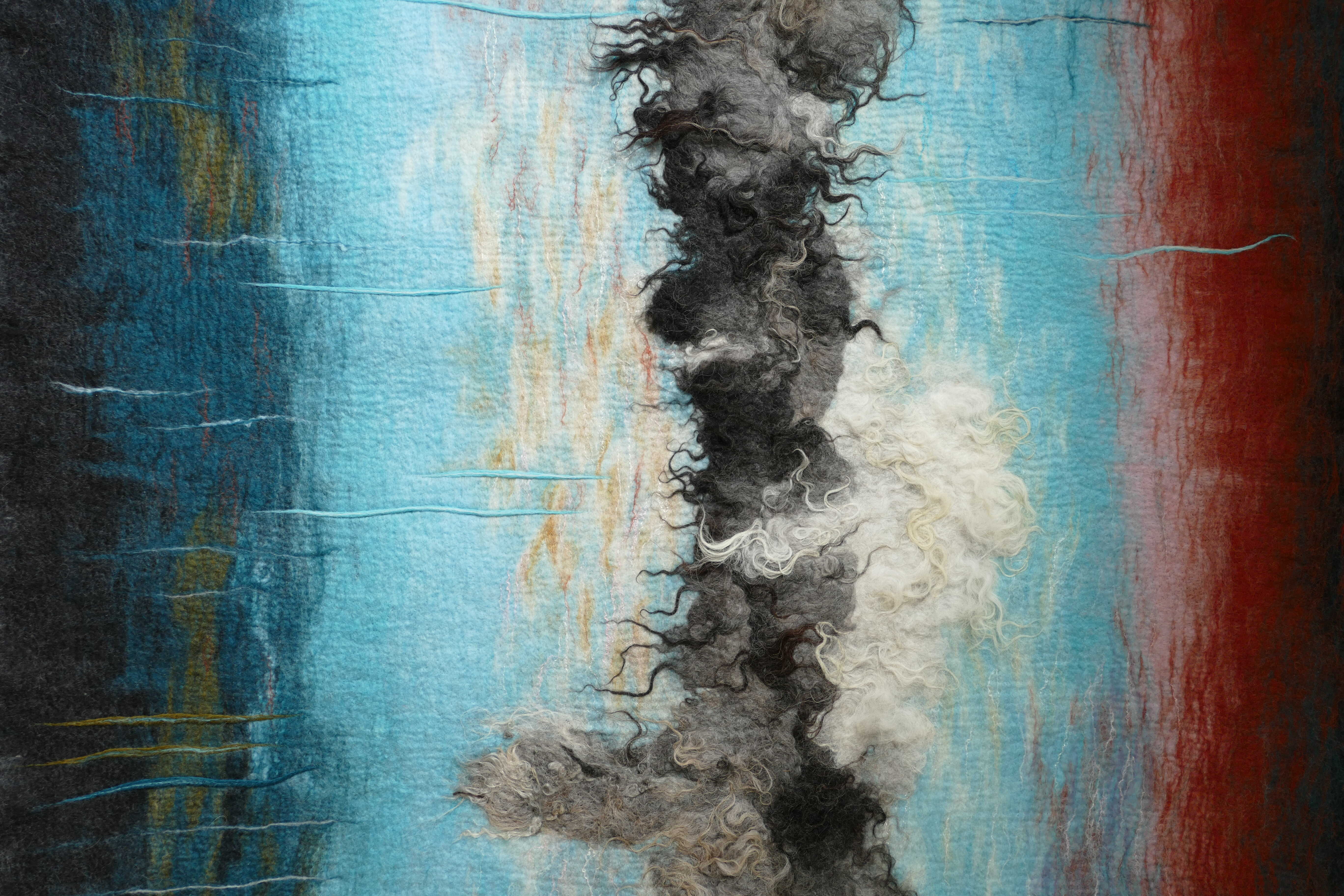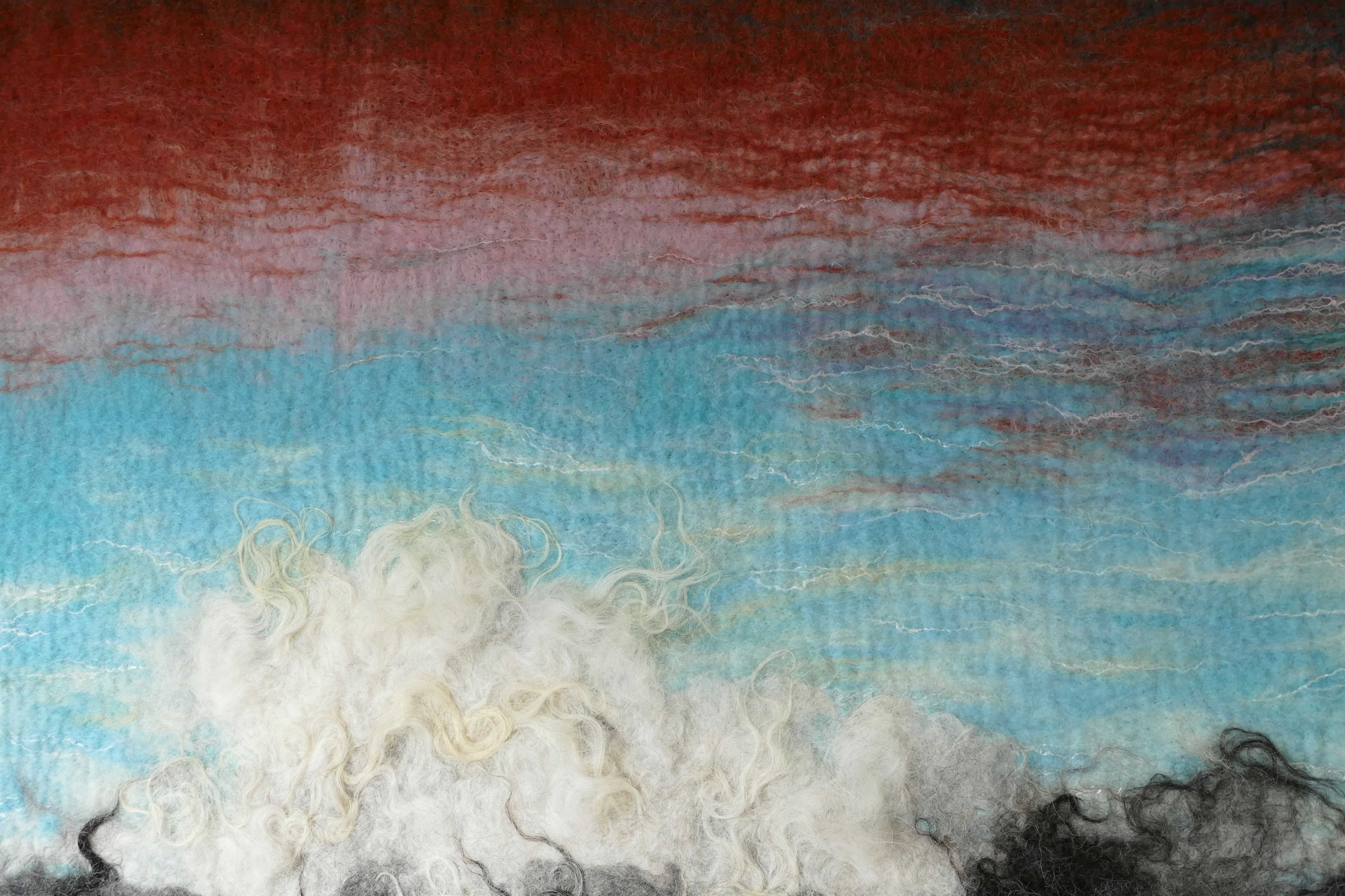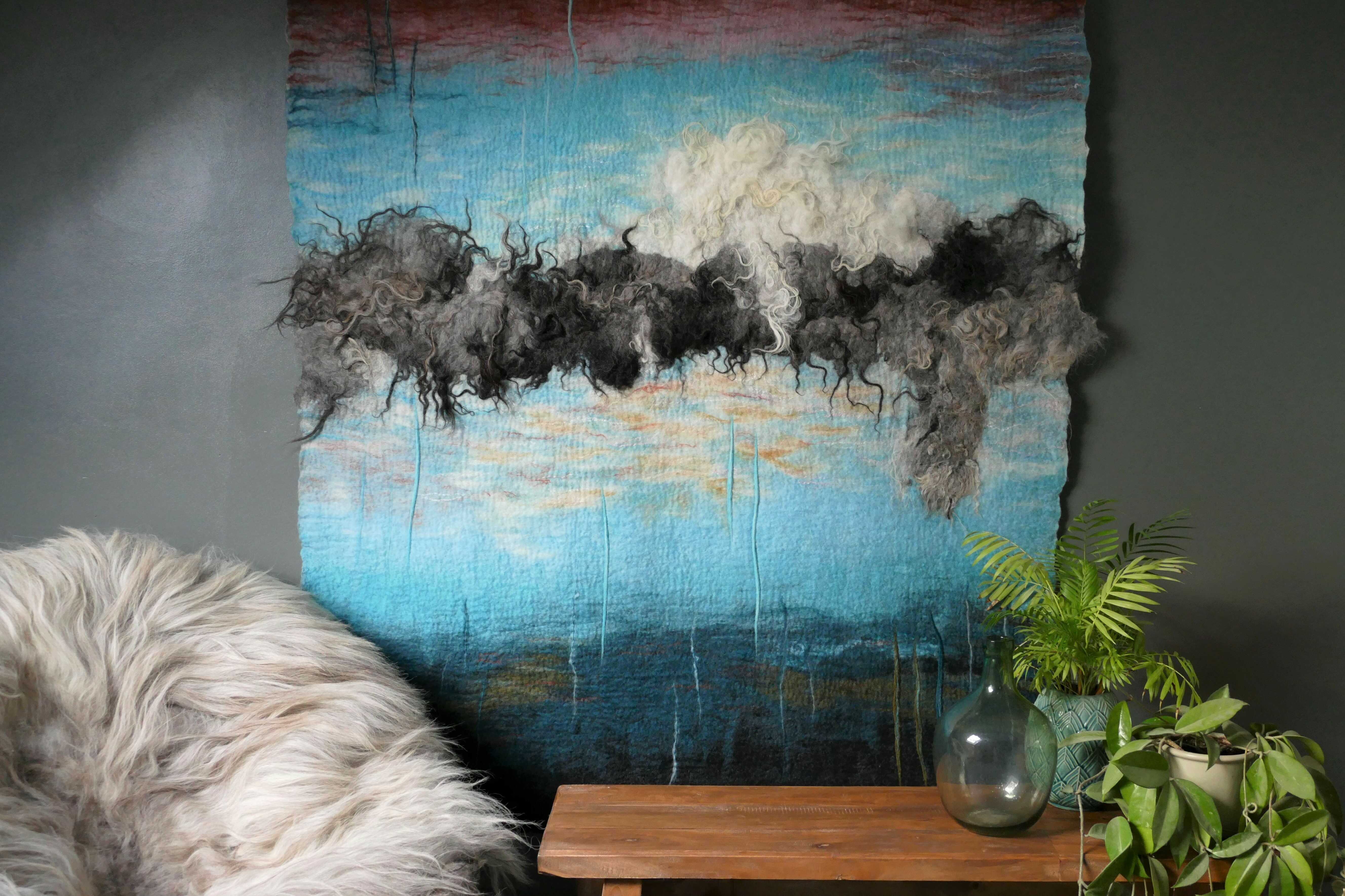 Wandkleed 'Avondrood' is gemaakt van Merinowol gecombineerd met de ruwe wol van een Veluws Heideschaap en bamboe en zijdevezels.
