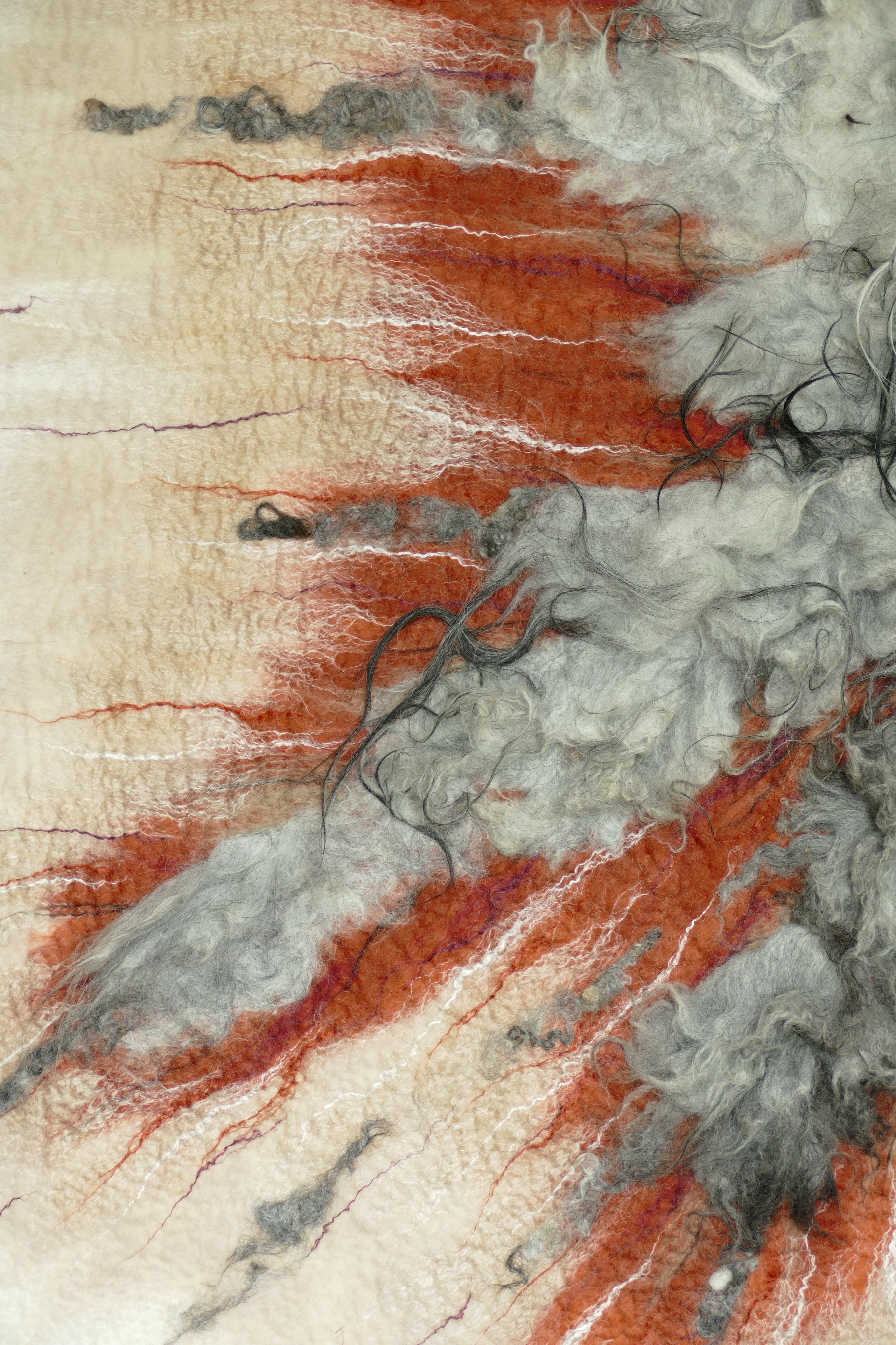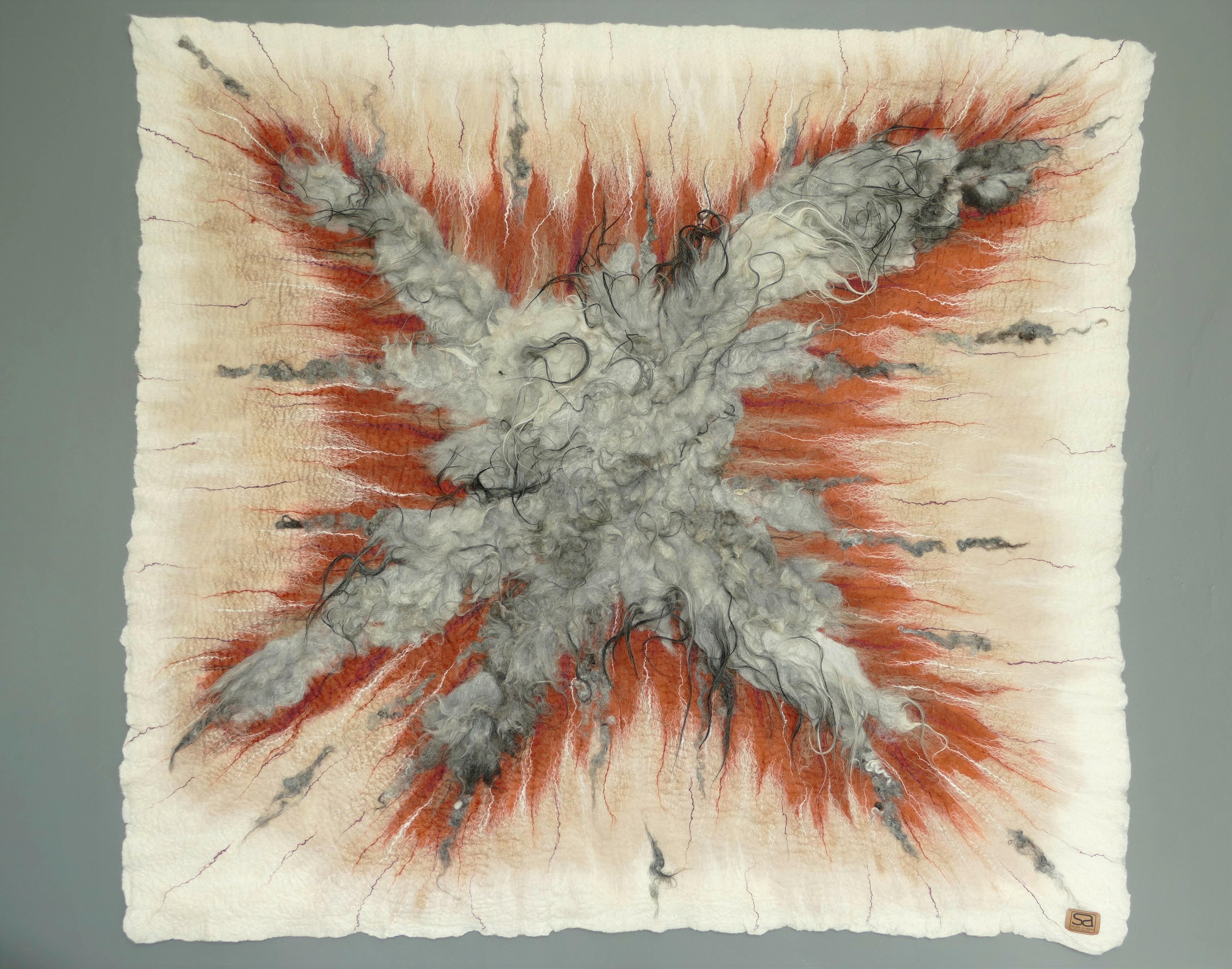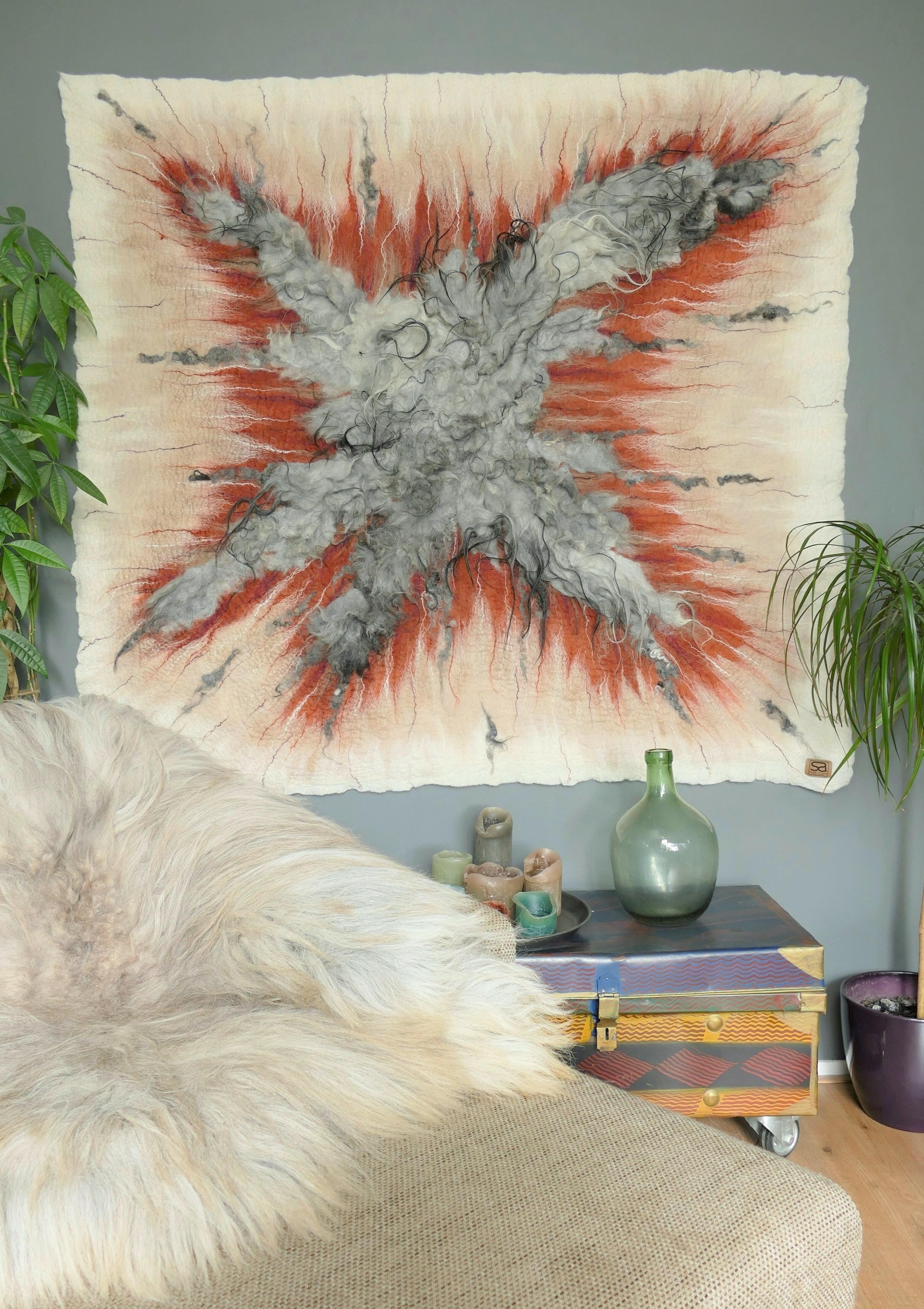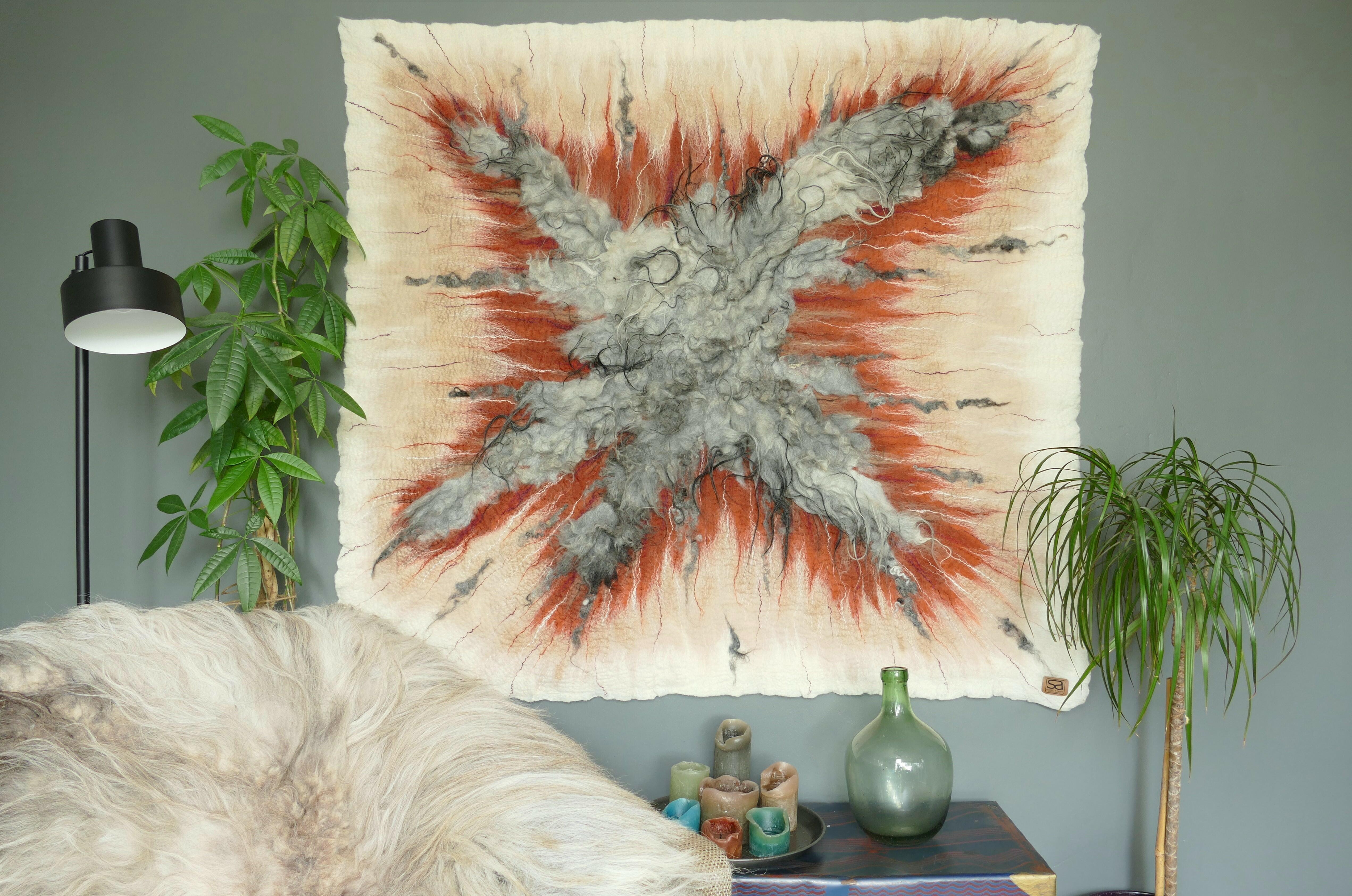 Wandkleed vilt 'Five Elements' is gemaakt in opdracht voor een gezin van vijf uit België. De familie wilde graag een kleed met een persoonlijke verwijzing naar hun gezin met drie energieke kinderen.