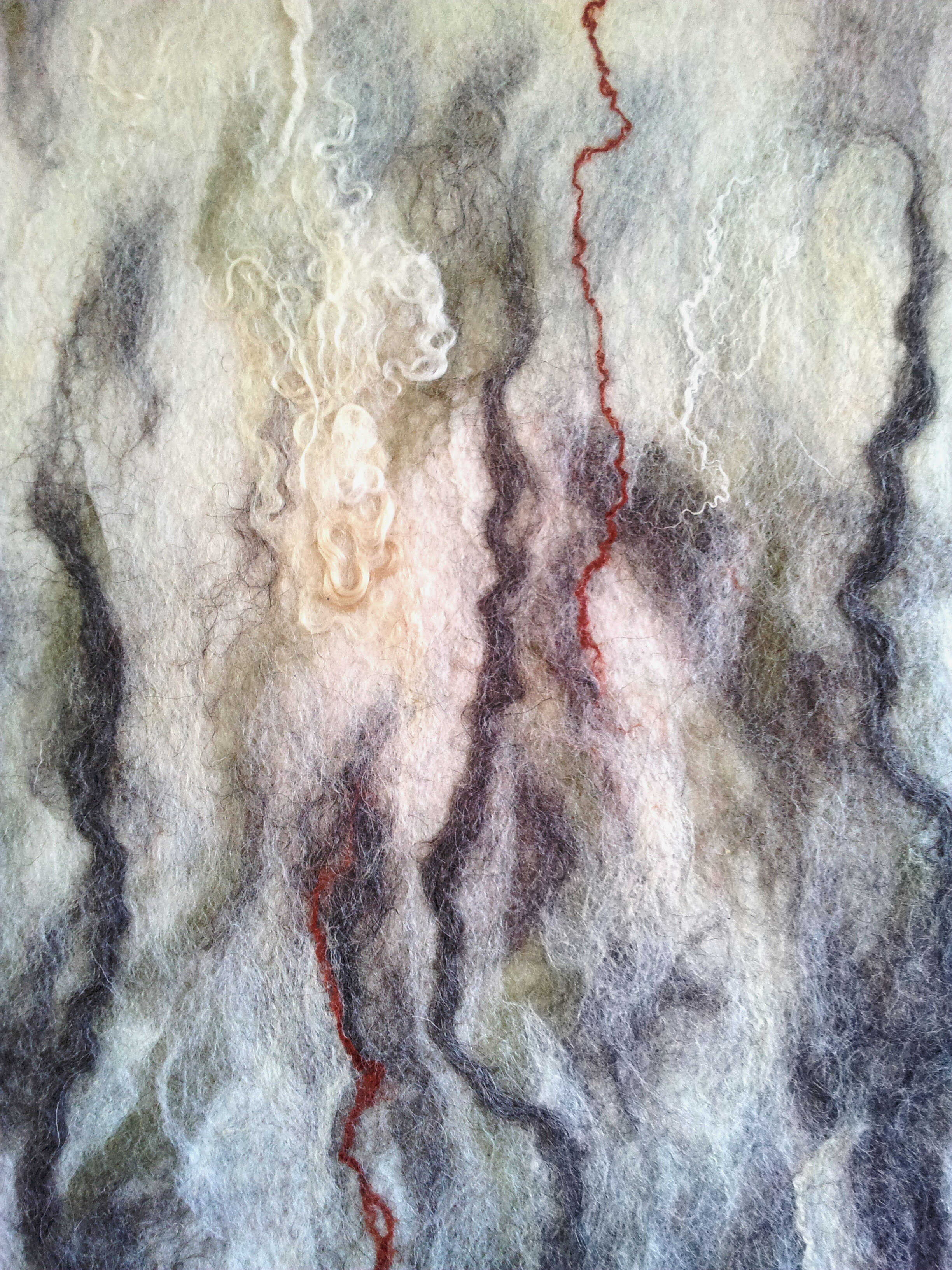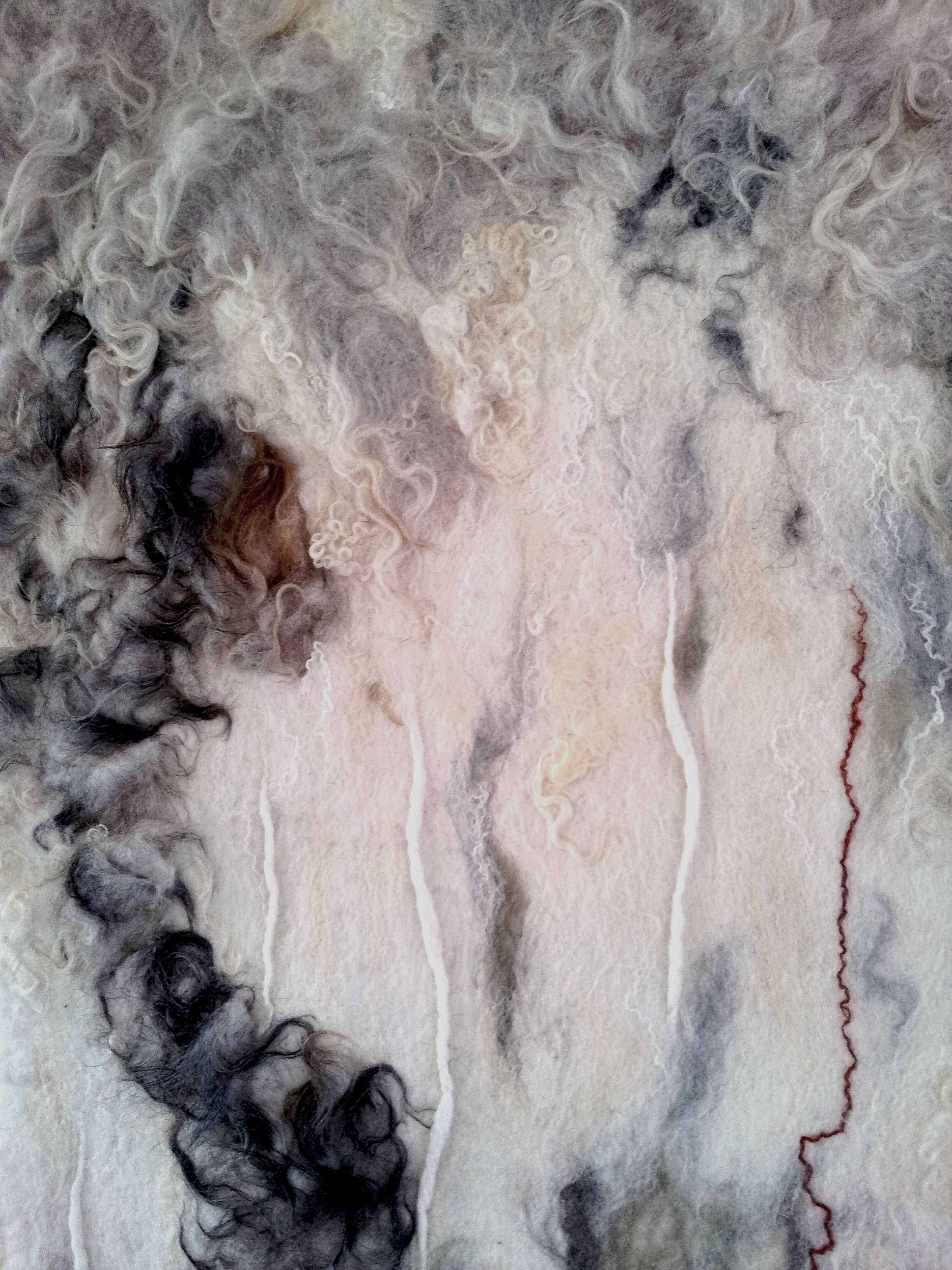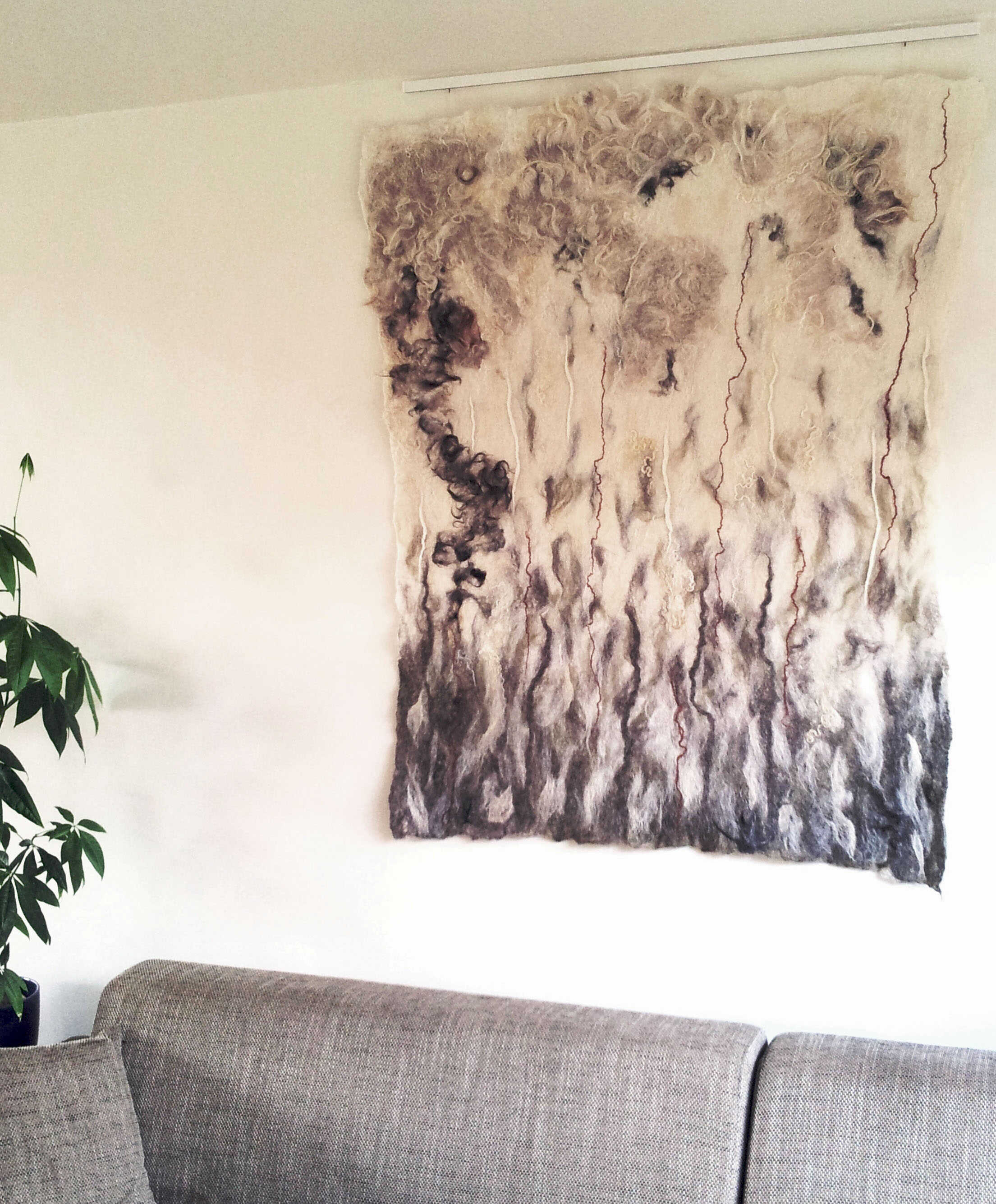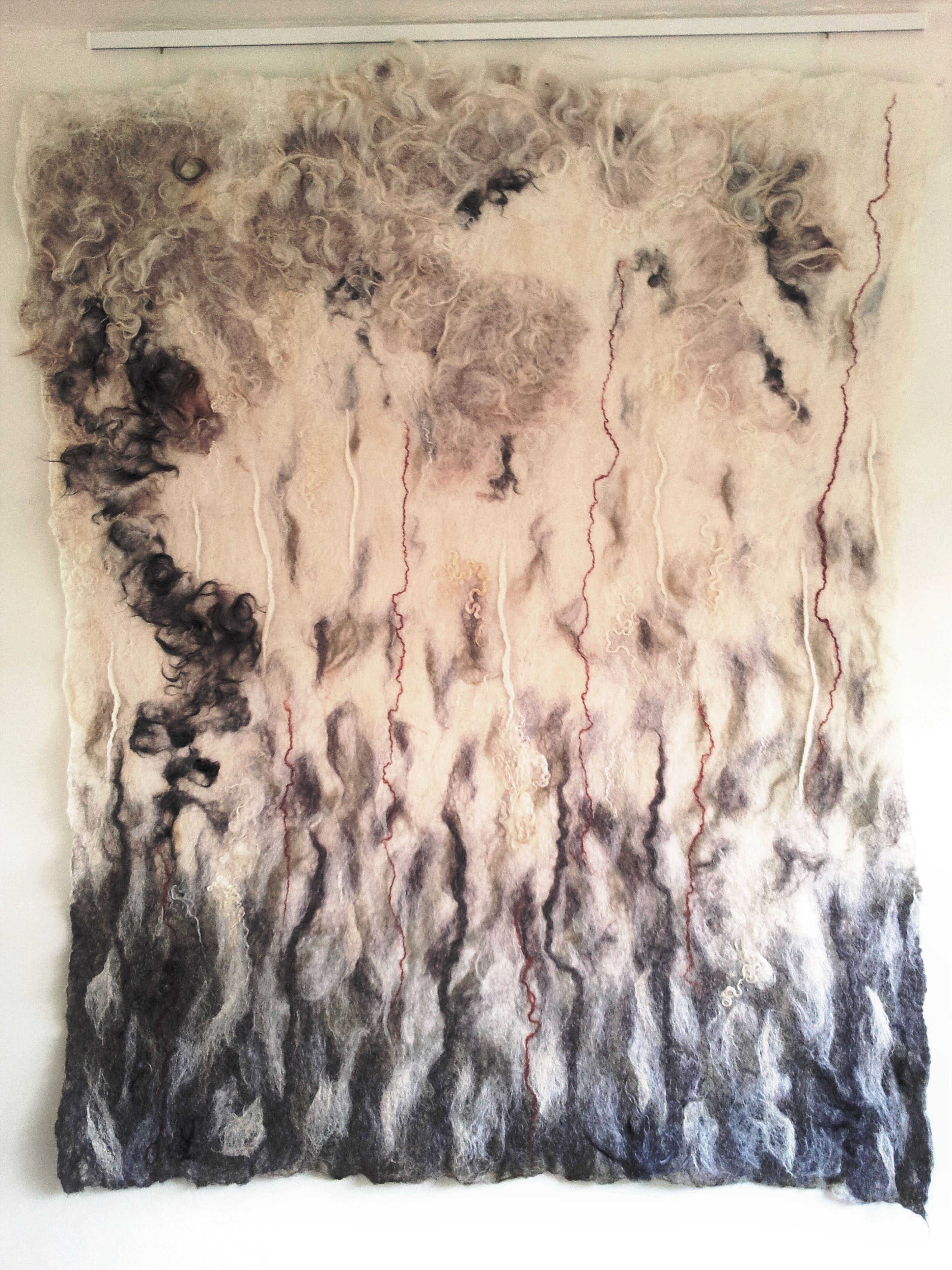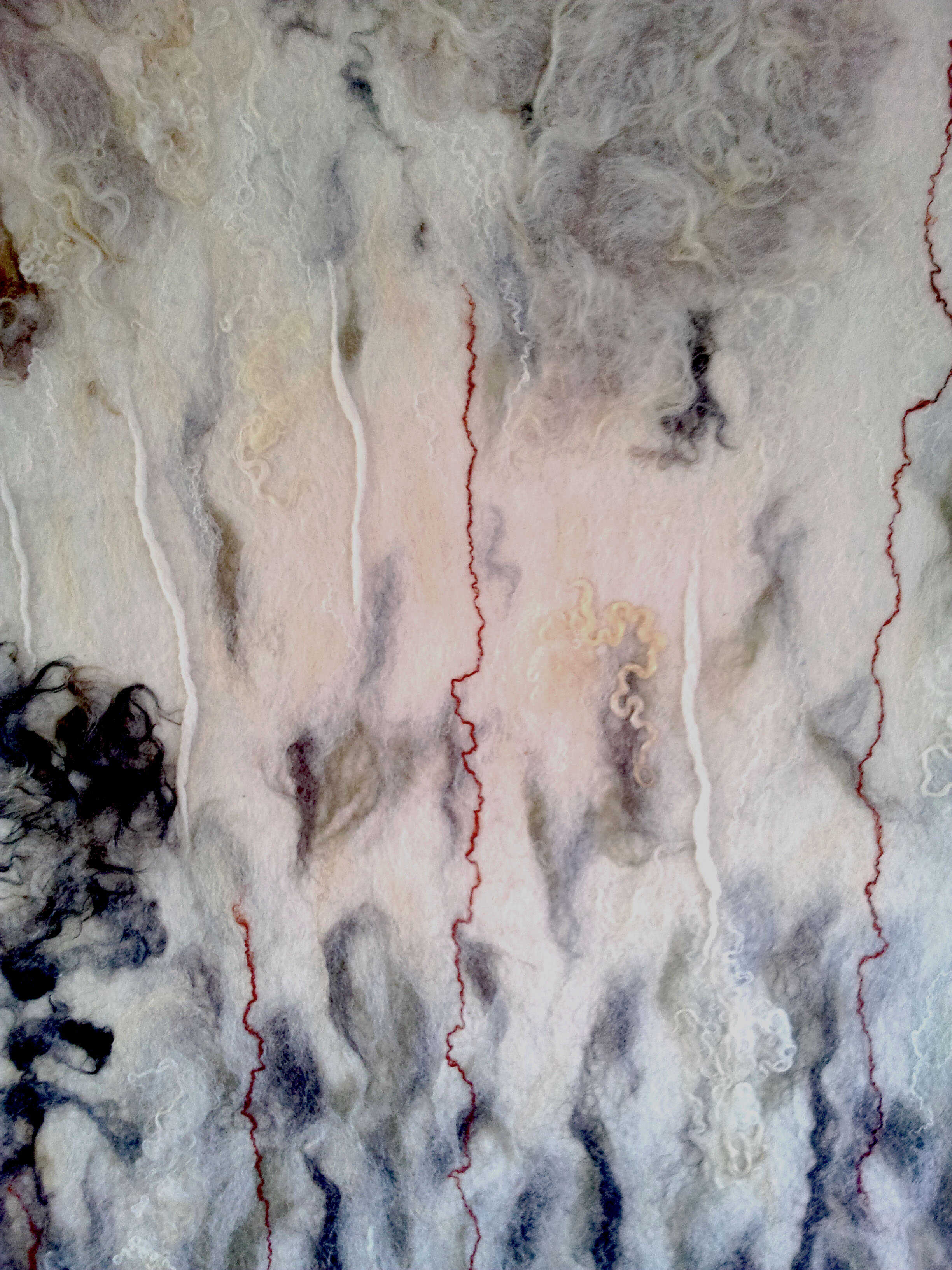 Wandkleed gemaakt in opdracht voor Qi-Point Praktijk voor Acupunctuur in Arnhem. Gebruikte materialen: wol van het Drents heideschaap, Merino wol, Wenseleydale, Gotland en zijde.