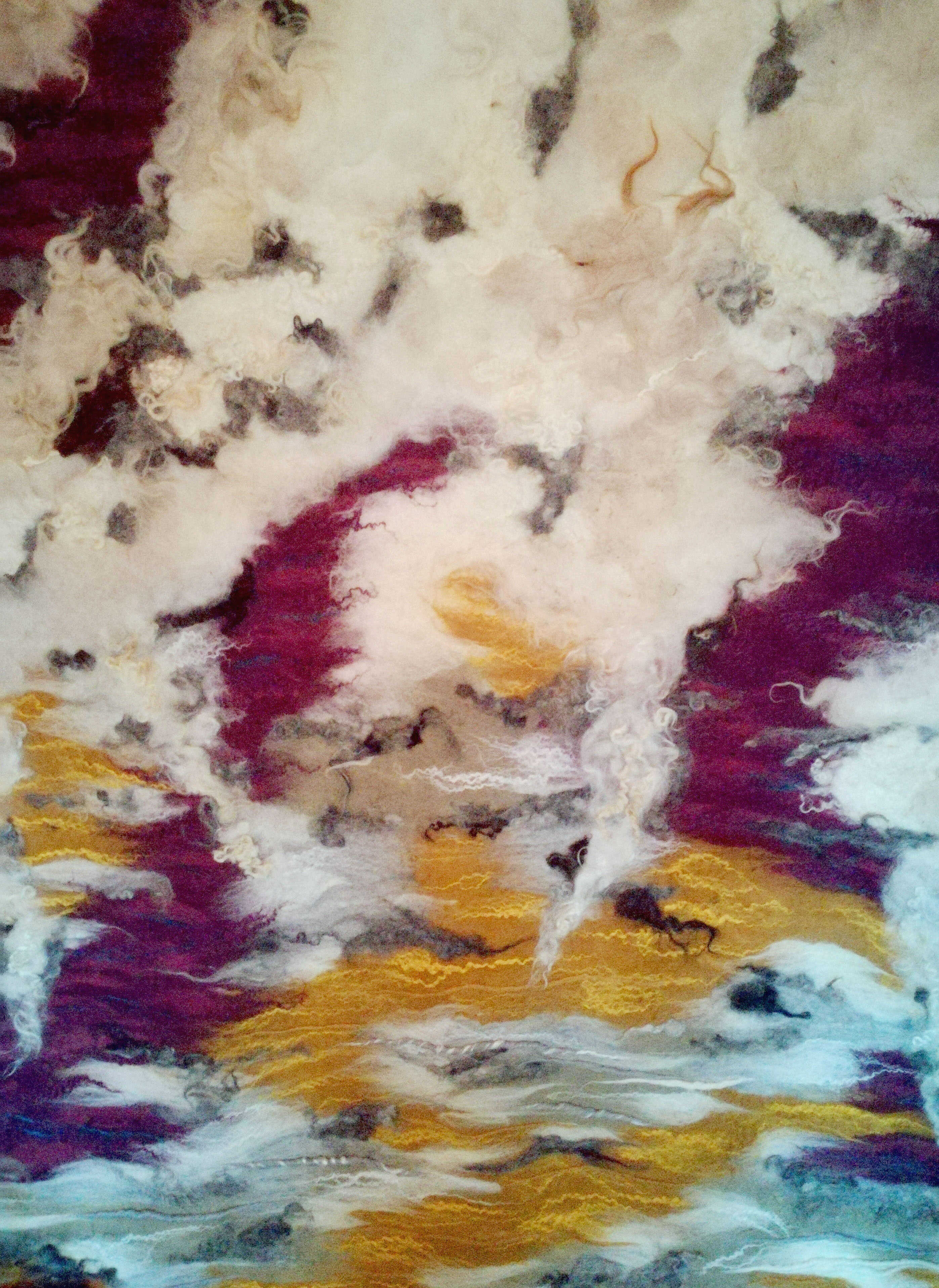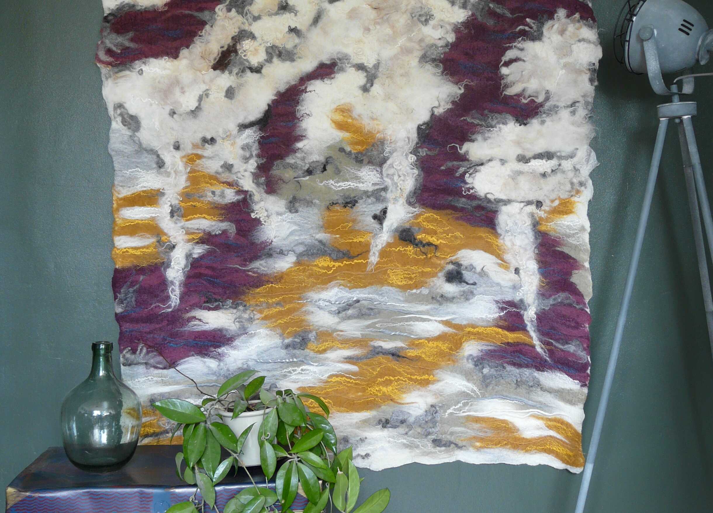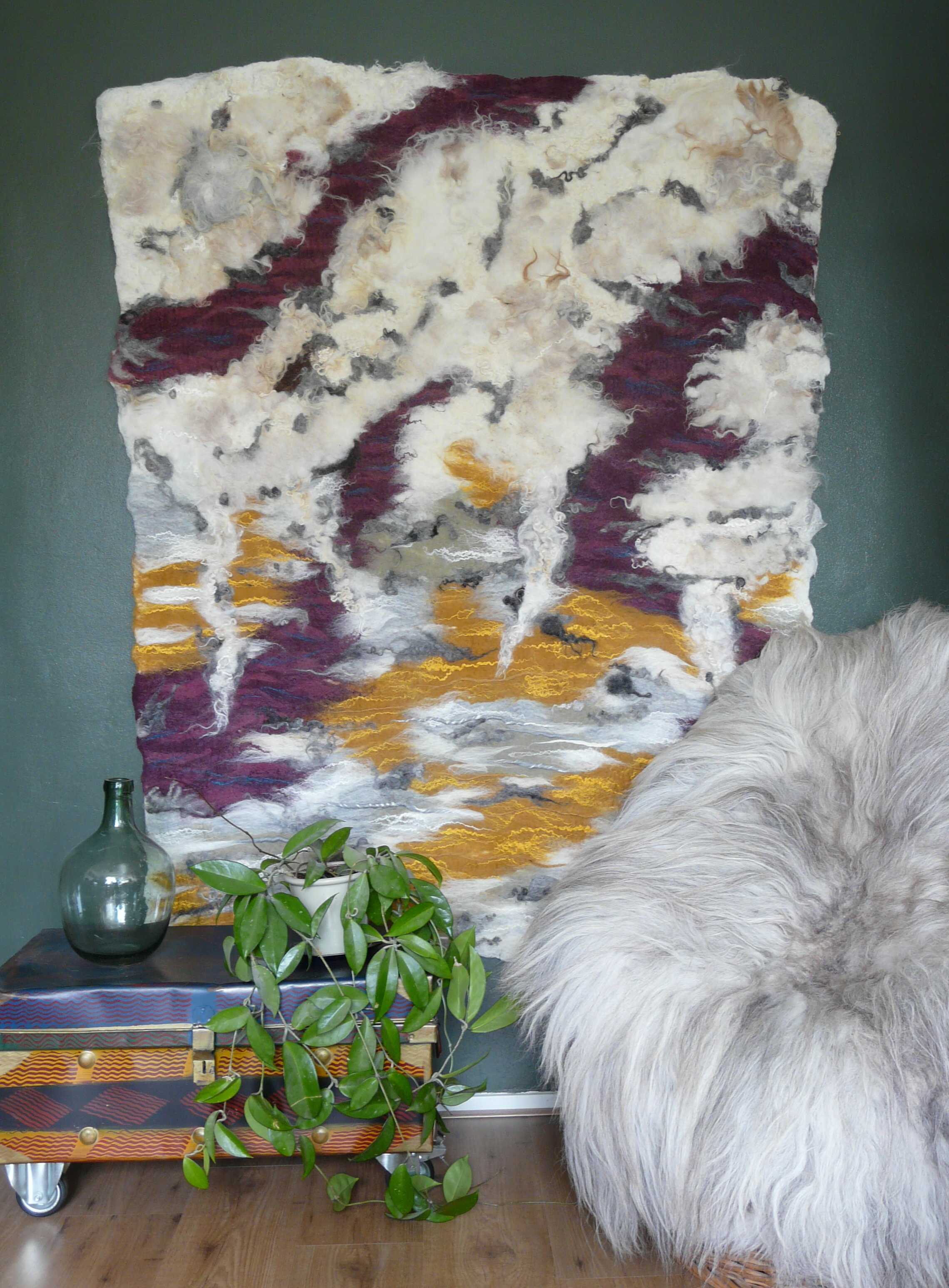 Wandkleed 'Sunset' is gemaakt van: Drents heideschaap wol, Merino wol, Wenseleydale, Mohair, Gotland en zijde.