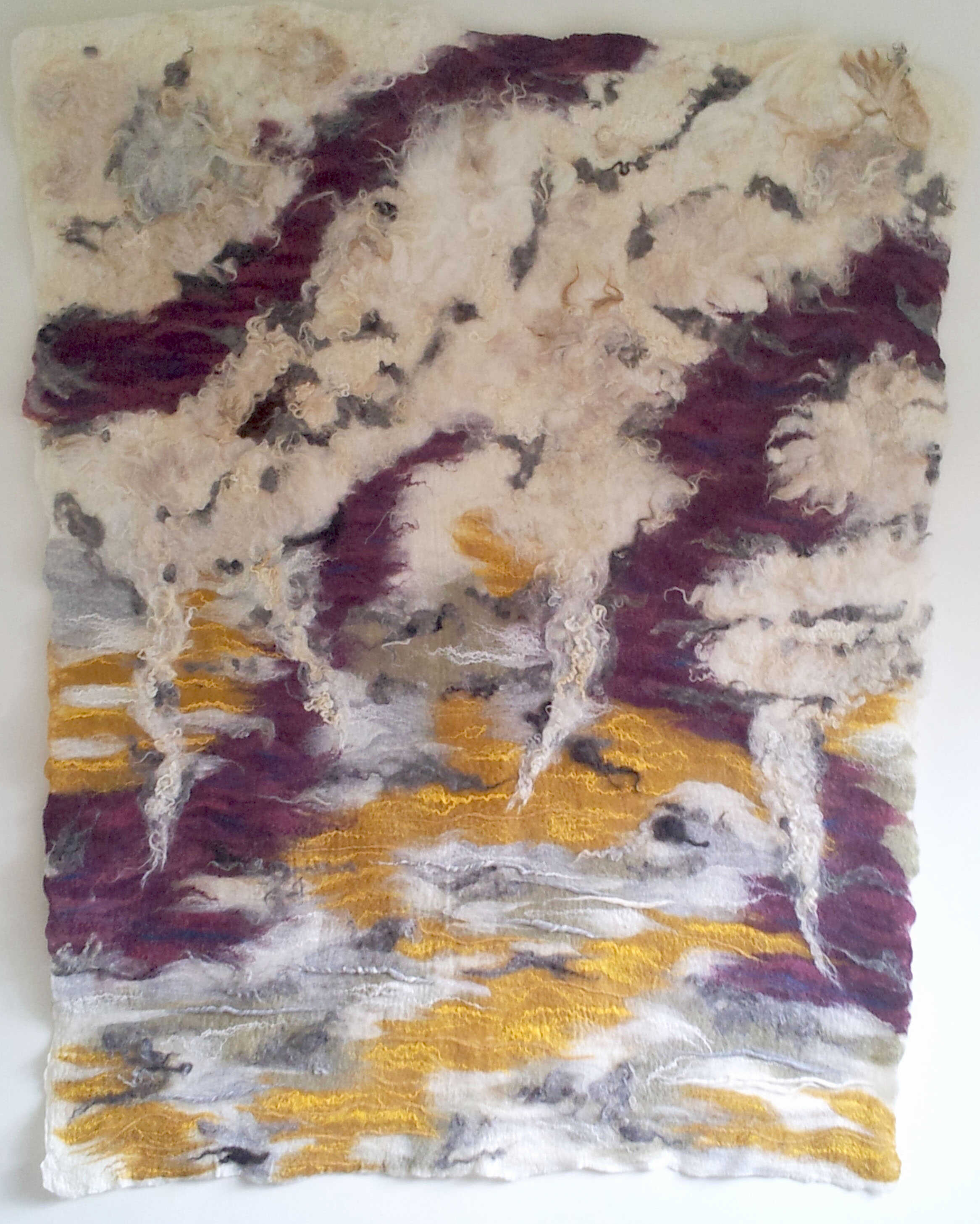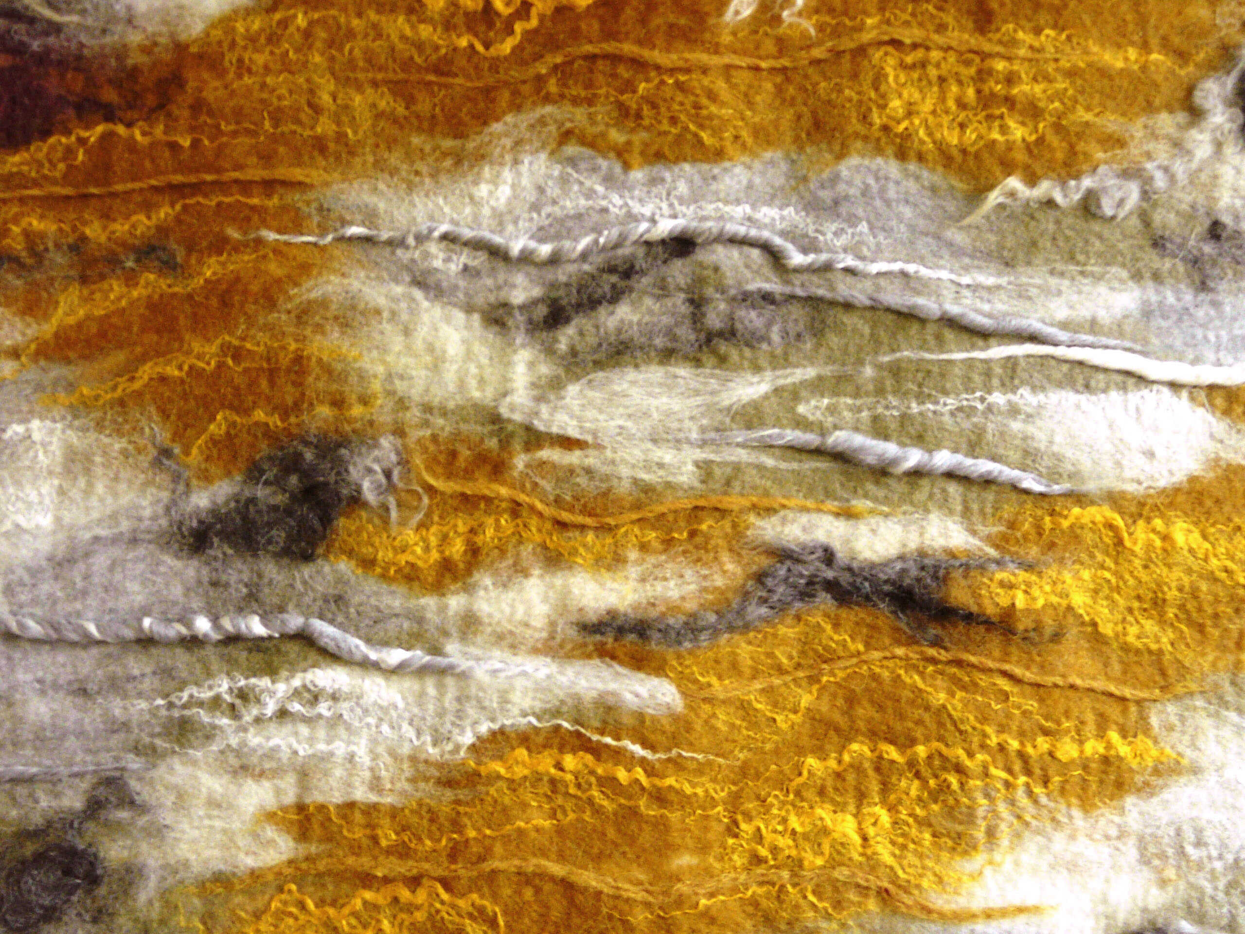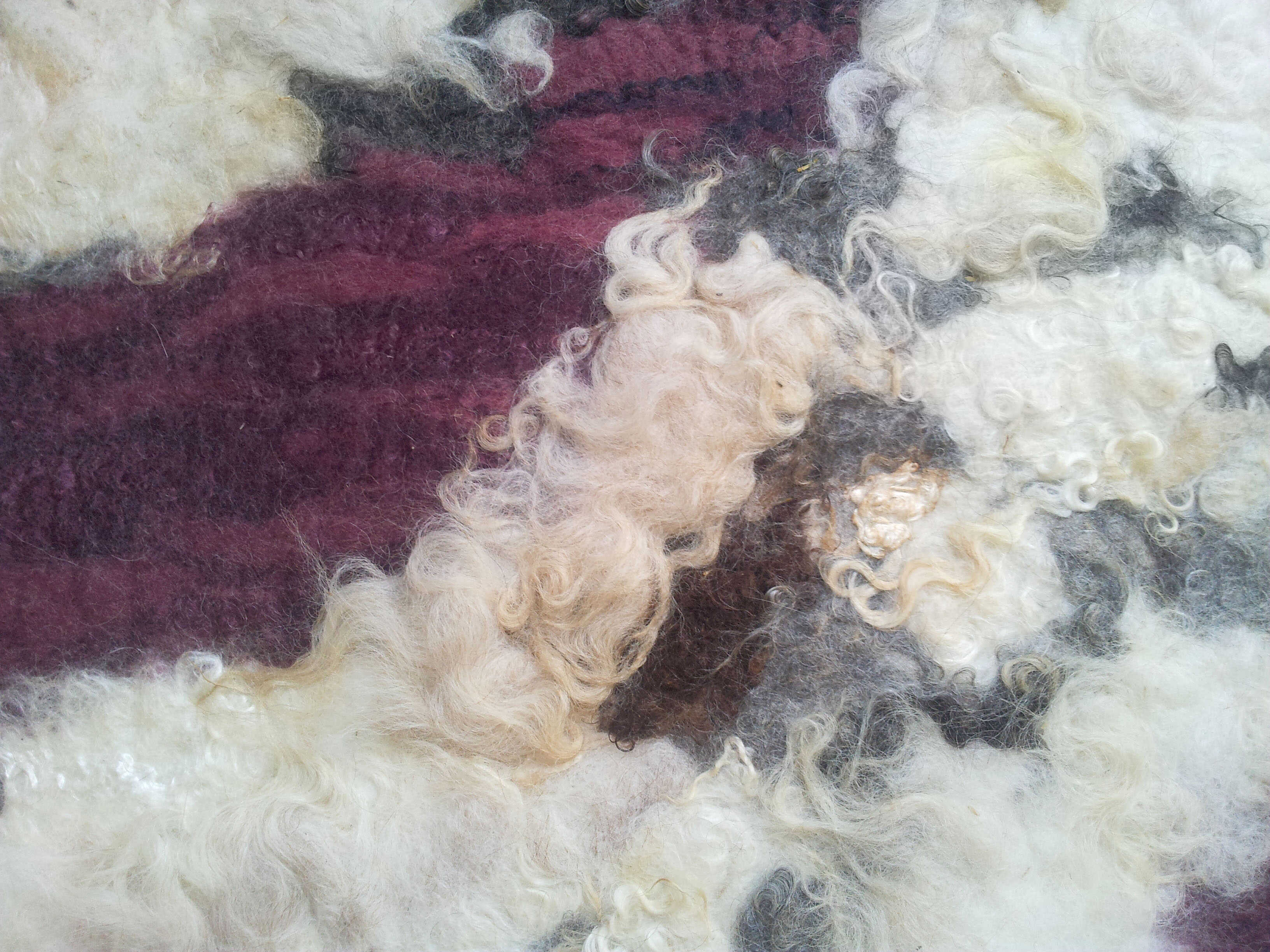 Wandkleed 'Sunset' is gemaakt van: Drents heideschaap wol, Merino wol, Wenseleydale, Mohair, Gotland en zijde.